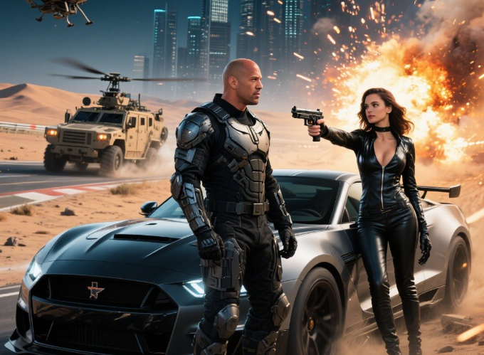 David Leitch directs with kinetic precision, balancing the beauty of motion with the brutality of consequence. The chase sequences are visceral poetry — filmed in single takes, engines roaring through neon cities and desert wastelands. One breathtaking mid-film pursuit, shot across Dubai’s mirrored highways, has already been hailed as one of the greatest car sequences ever filmed. Metal, light, and dust blur into pure adrenaline.