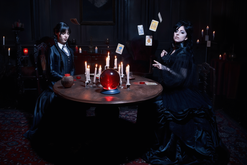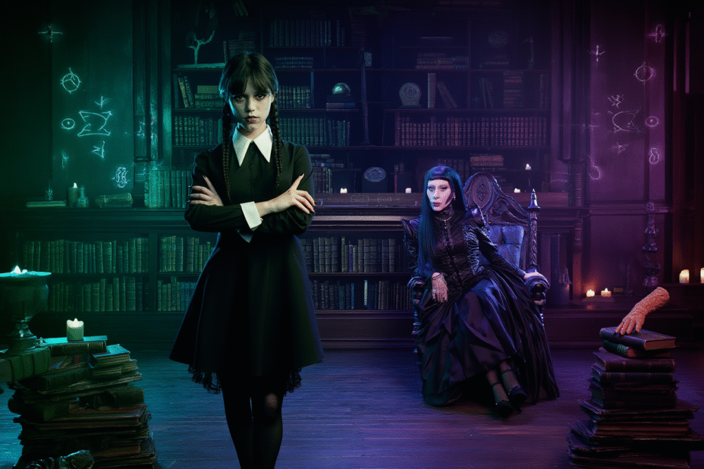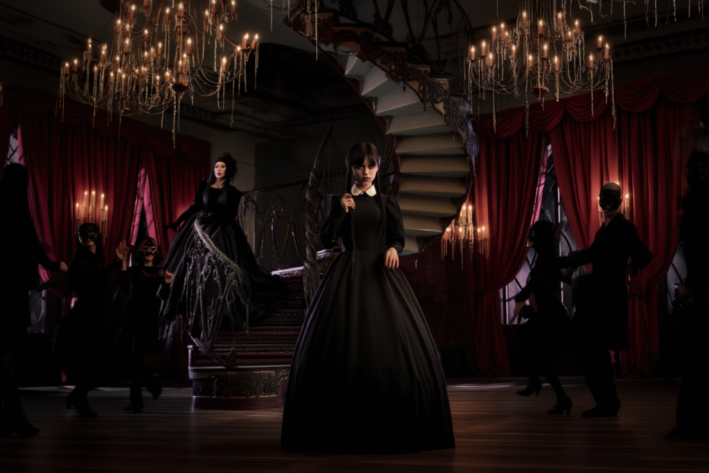 Visually, Wednesday Season 3 is a triumph. Gothic fashion becomes storytelling, with black silks, blood-red accents, and avant-garde designs reflecting power, rebellion, and corruption. The show understands that style is not decoration—it is identity, ideology, and threat.