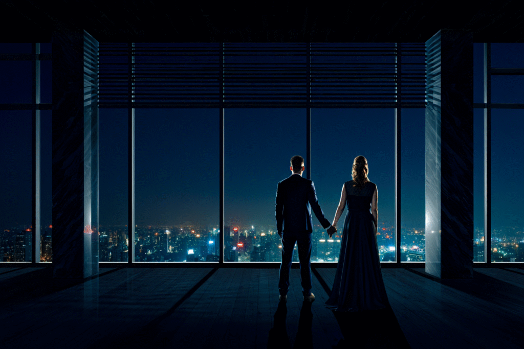 Visually, Bound by Legacy trades explicit spectacle for atmosphere. The sensuality is still present, but it’s colder, more deliberate — luxury interiors contrasted with emotional distance. The film leans into stillness: pauses, glances, withheld words. Desire is no longer impulsive; it’s dangerous precisely because it’s controlled.
