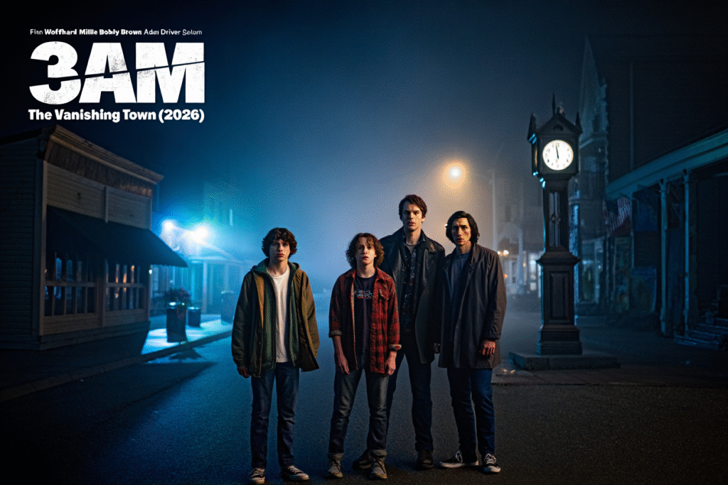 The film follows a group of teenagers who stumble upon a forgotten town that only appears at exactly 3AM. By sunrise, it vanishes without a trace. Finn Wolfhard leads the story with quiet intensity, portraying a curious but emotionally guarded character whose skepticism slowly crumbles into dread. His performance captures the fragile line between bravery and terror with remarkable authenticity.