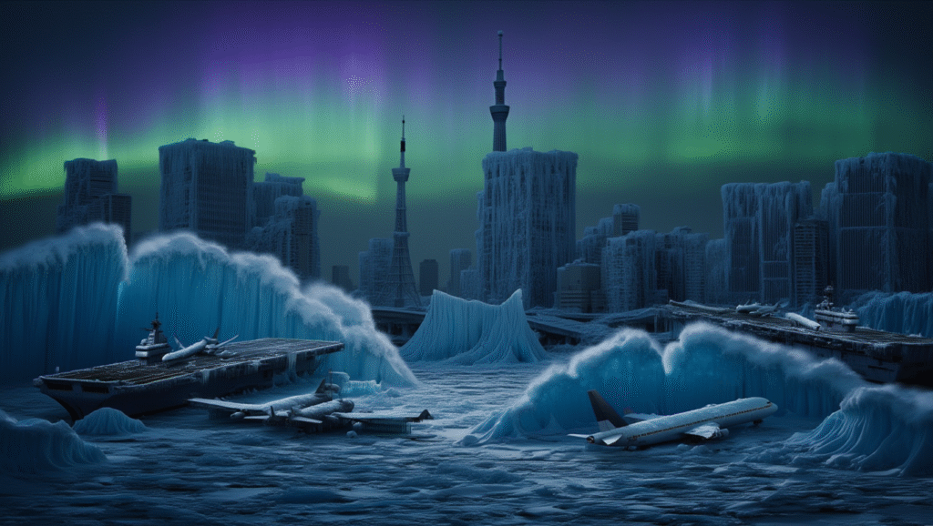 Visually, this chapter is staggering. Tokyo Bay transforms into a graveyard of motion—aircraft carriers locked in ice, tidal waves frozen mid-crash, skyscrapers encased in crystalline frost. The spectacle isn’t loud. It’s suffocating.