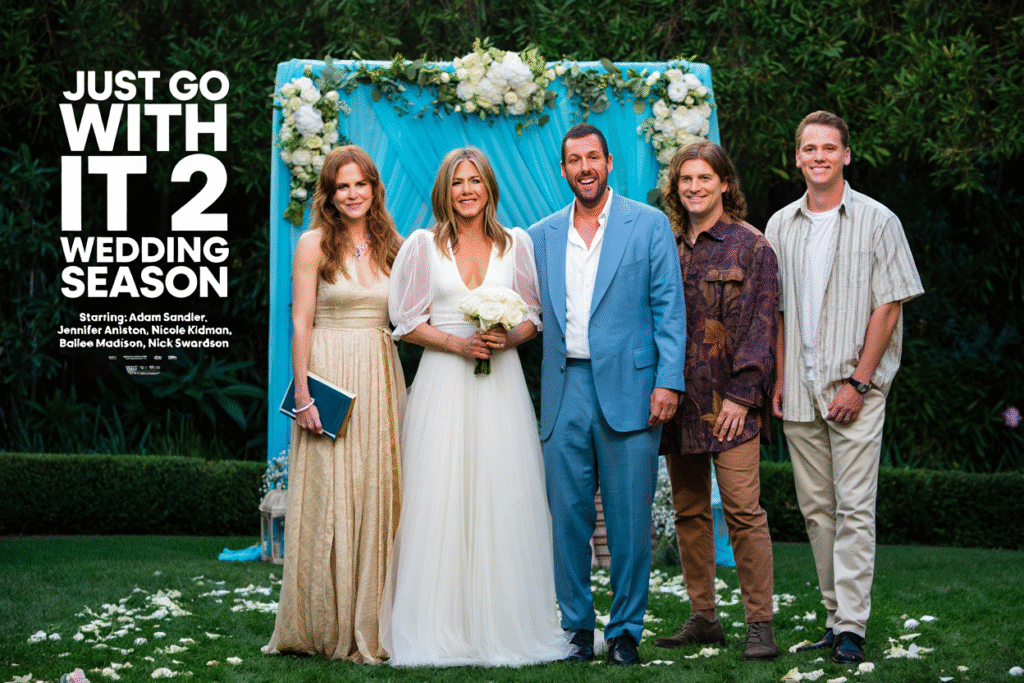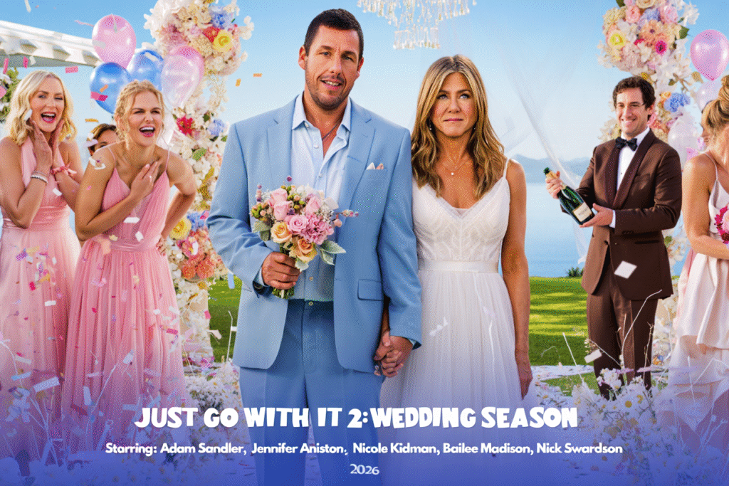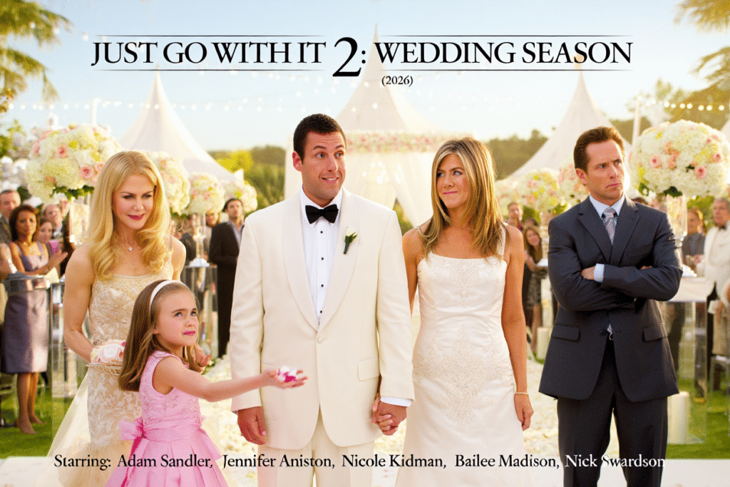 Some lies are harmless. Some lies spiral. And then there are the lies that somehow lead you back to love. Just Go With It 2: Wedding Season (2026) reunites the chaotic chemistry of Adam Sandler and Jennifer Aniston, with scene-stealing energy from Nicole Kidman, Bailee Madison, and Nick Swardson. This sequel doesn’t just revisit mistaken identities — it escalates them, wrapping romance in layers of obligation, ego, and very public vows.