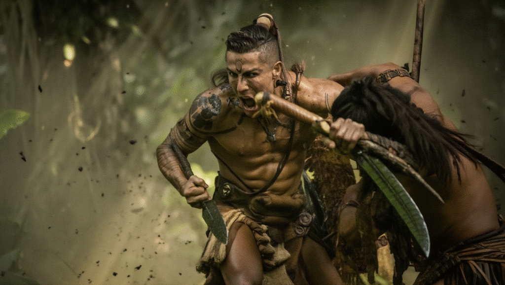 Cristiano Ronaldo’s warrior embodies this moral conflict. He is powerful, relentless, and feared, yet the prophecy forces him to confront the weight of leadership and destiny. The jungle tests not only his body but his spirit, pushing him toward choices that could either save his people or doom them all.
