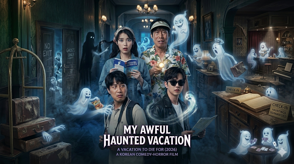 What happens when an innocent vacation turns into a supernatural nightmare? “My Awful Haunted Vacation” (2026) answers that question with an unforgettable blend of comedy and horror. The story revolves around four friends—Jun-Ki (Yoo Hae-jin), So-Jung (IU), Tae-Young (Cha Tae-hyun), and Min-Joon (Yoo Seung-ho)—who embark on what should be a perfect getaway, only to find themselves trapped in a haunted hotel. What begins as a relaxing vacation quickly spirals into chaos, and what follows is one of the most hilarious and spine-chilling nights of their lives.