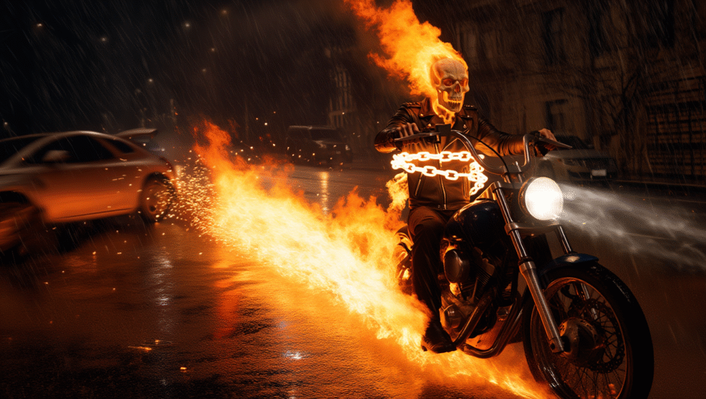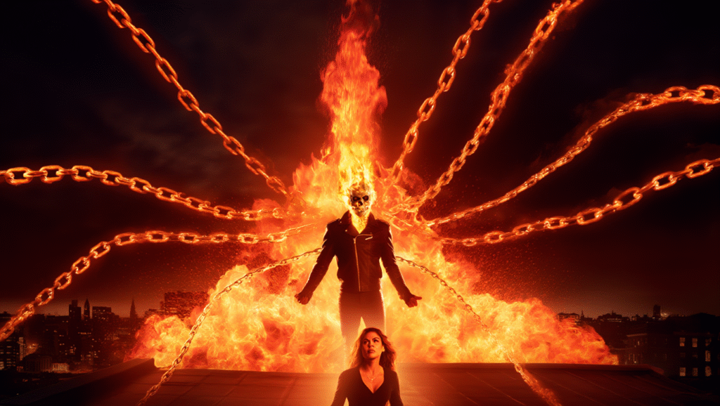 The action is brutal and infernal. Chains slice through the dark like living serpents. Motorcycles roar with demonic fury. Flames don’t merely burn—they judge.